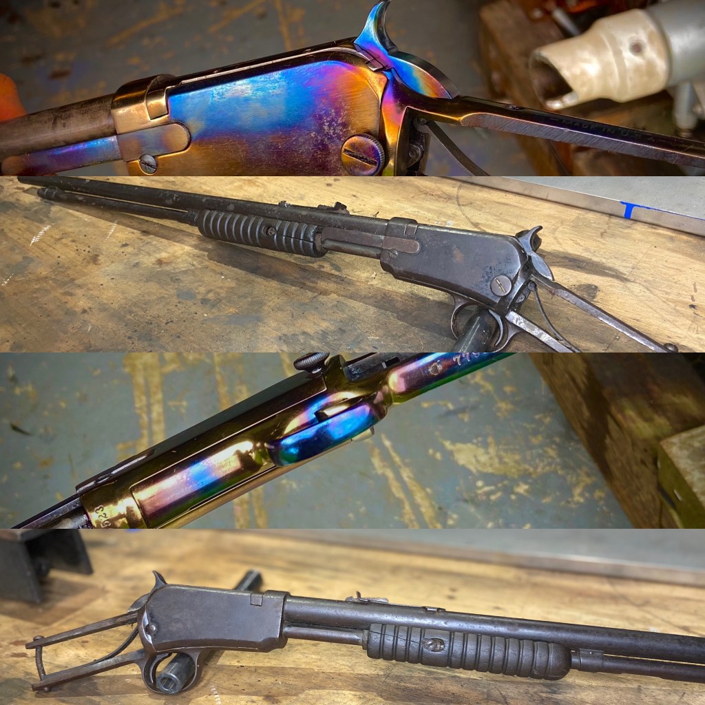 Along with the mag latch needing to be shimmed to assist with feeding and mag stability this piece had been hastily touched up with spray paint. The alloy action was polished and the barrel was polished and blued.